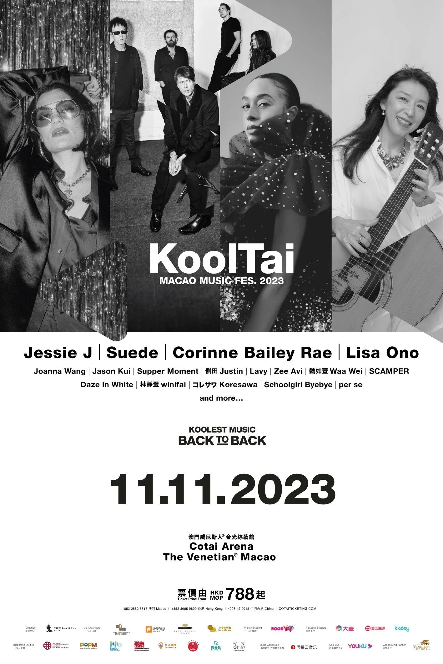 KoolTai ALL IN ONE DAY! 由棋人娛樂主辦的大型音樂節演出「KoolTai MACAO MUSIC FES. 2023」匯集多個來自英國、日本、馬來西亞、內地、台灣、香港以及澳門,超過16隊重量級演出陣容,呈現超過11小時浪接浪震撼演出!是次音樂節更是金光綜藝館史上最長時間馬拉松式音樂演出,誠邀來自全球各地的音樂愛好者齊聚澳門,盡情享受跨越地域、語言界限的音樂盛宴!