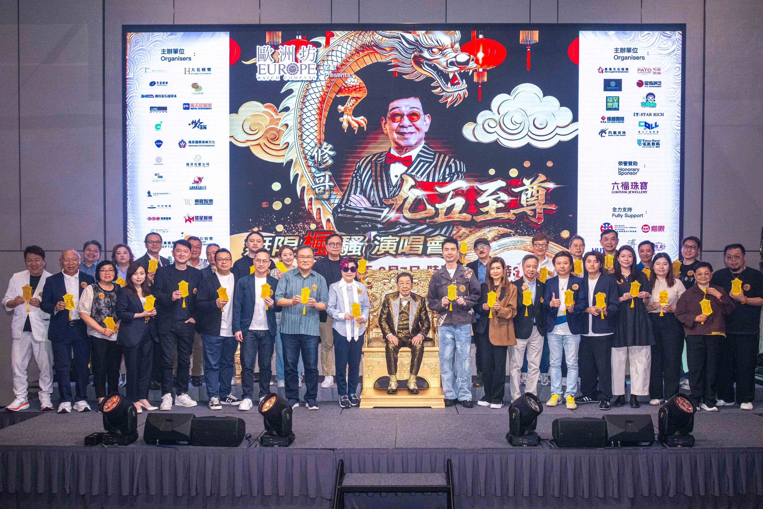 記者會上名譽贊助六福珠寶專誠給修哥送上價值超過港幣10萬元之「金龍盤柱」實體黃金擺件,祈願修哥龍精虎猛、龍馬精神。在40間主辦單位和修哥的合照環節上,大家拿出令牌,由修哥發施號令齊心把今次演唱會做到最好。冠名贊助「歐洲坊鐘表」聯同四十八家主辦單位及支持機構,給修哥送上以金龍玉璽為造型設計的精美蛋糕,預祝演唱會順利及票房大賣。天星娛樂陳淑芬陳太同時有好消息公佈:「現正為修哥以《九五至尊無限楓騷演唱會》申請挑戰《舉辦演唱會最年長華語藝人 》之世界紀錄,我們相信有大家的支持,今次挑戰一定成功。」