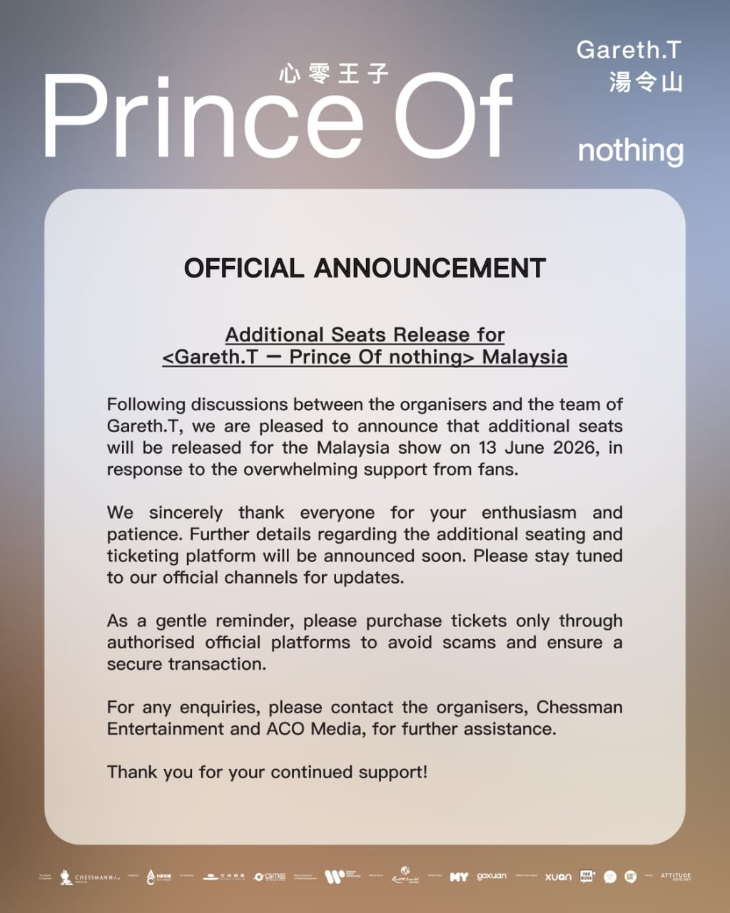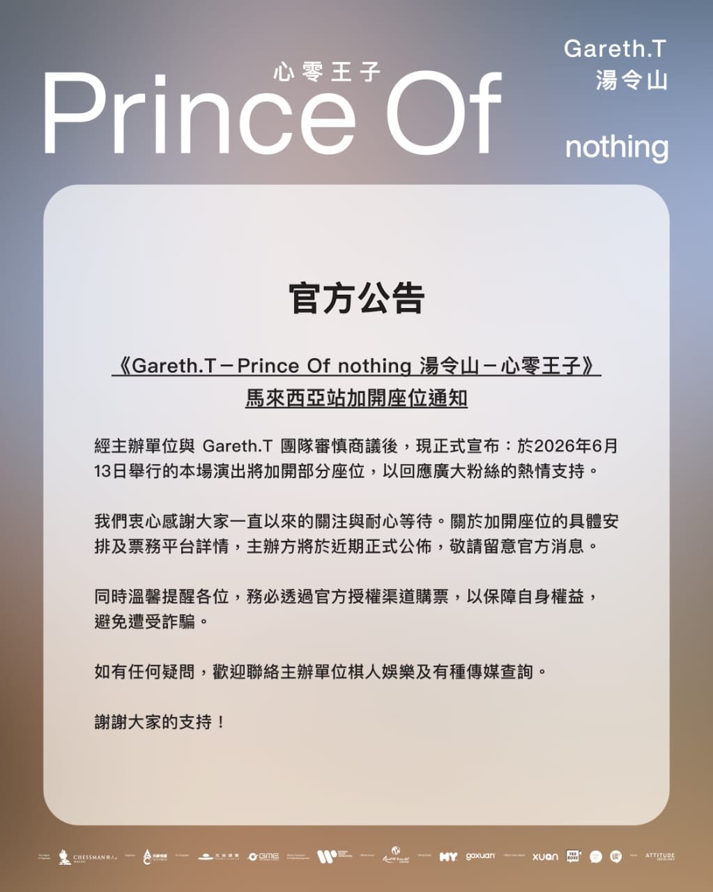 《Gareth.T -Prince Of nothing 湯令山 - 心零王子 》馬來西亞站|加開部分座位