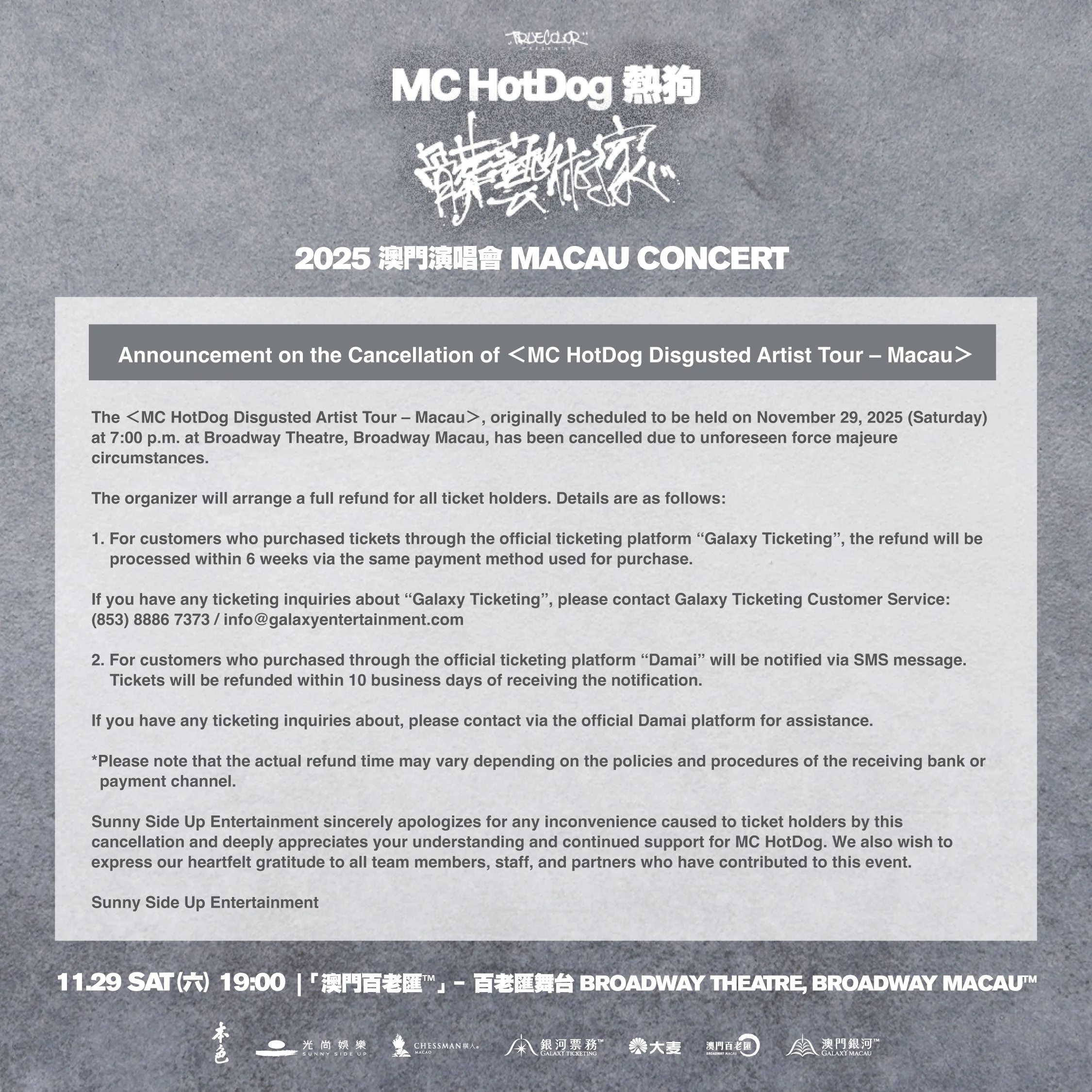 原定於2025年11月29日(星期六)晚上7時正在「澳門百老匯」- 百老匯舞台舉行的<MC HotDog 熱狗《髒藝術家》巡迴演唱會–澳門>,因無法預料的不可抗力情況,主辦單位遺憾地宣布是次演出將取消。