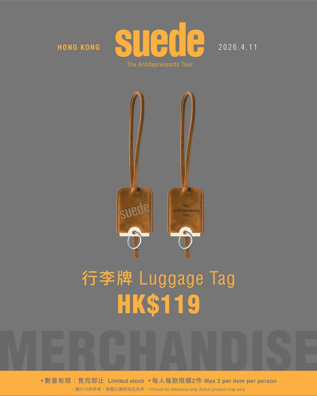 講起睇Show又點少得周邊商品呢!為咗襯番Suede嘅狂野搖滾本色,我哋為The Antidepressants Tour精心設計咗多款Merch,由經典不敗嘅Suede Logo T-shirt、帆布袋同襪、Rock Show必備嘅結他pick,到同Suede樂隊名襯到絕嘅麂皮皮革行李牌,以及香港站獨家限定發售,盡Show自在奔放Rock佬style嘅酒壺,真係睇相都心動!